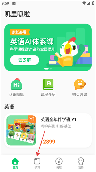 1、進(jìn)入嘰里呱啦首頁(yè),點(diǎn)擊底部學(xué)習(xí),進(jìn)入學(xué)習(xí)頁(yè)面。