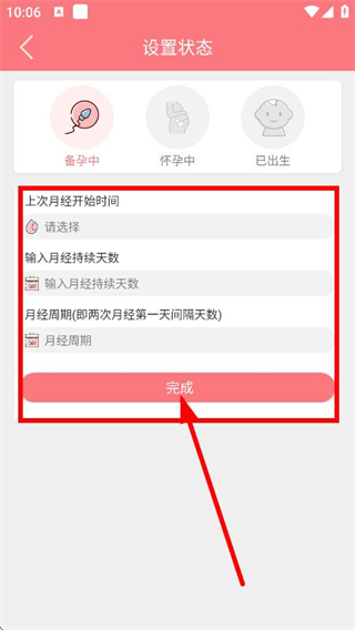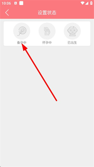 2、在設(shè)置狀態(tài)頁面,點(diǎn)擊備孕中,進(jìn)入備孕中信息填寫頁面。