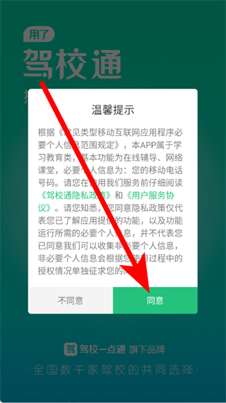 1、打開駕校通,在彈出的溫馨提示彈窗里點(diǎn)擊同意,進(jìn)入主界面。