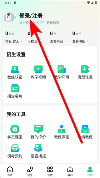 3、在我的頁面,點(diǎn)擊上方的登錄注冊選項(xiàng),進(jìn)入登錄注冊界面。