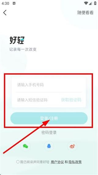 3、輸入手機(jī)號碼,獲取并輸入短信驗證碼,點擊登錄/注冊,完成登錄或注冊操作。