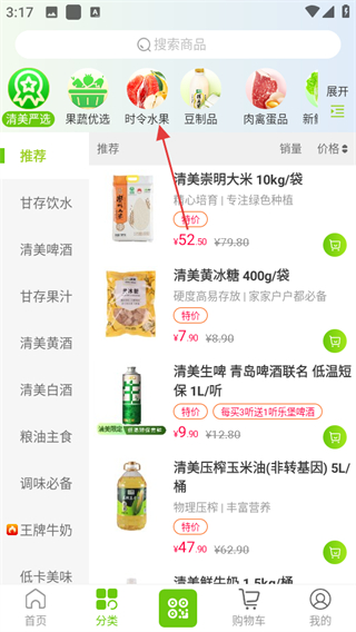 2、在分類頁面,點擊時令水果,進入時令水果商品頁面。