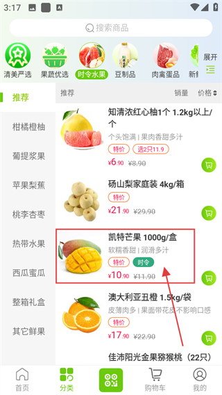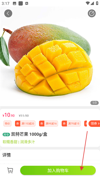 3、在時令水果商品頁面,選擇凱特芒果1000g,進入該商品詳情頁面。
