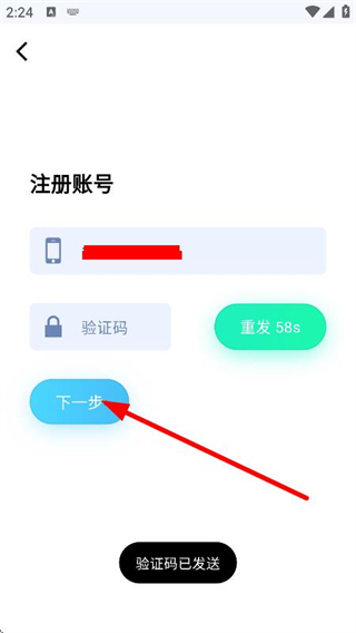 3、在注冊賬號頁面,輸入手機號獲取驗證碼并填寫后,點擊下一步。