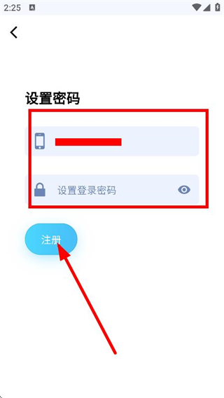 4、在設(shè)置密碼頁面,設(shè)置登錄密碼后,點擊注冊,完成注冊操作。
