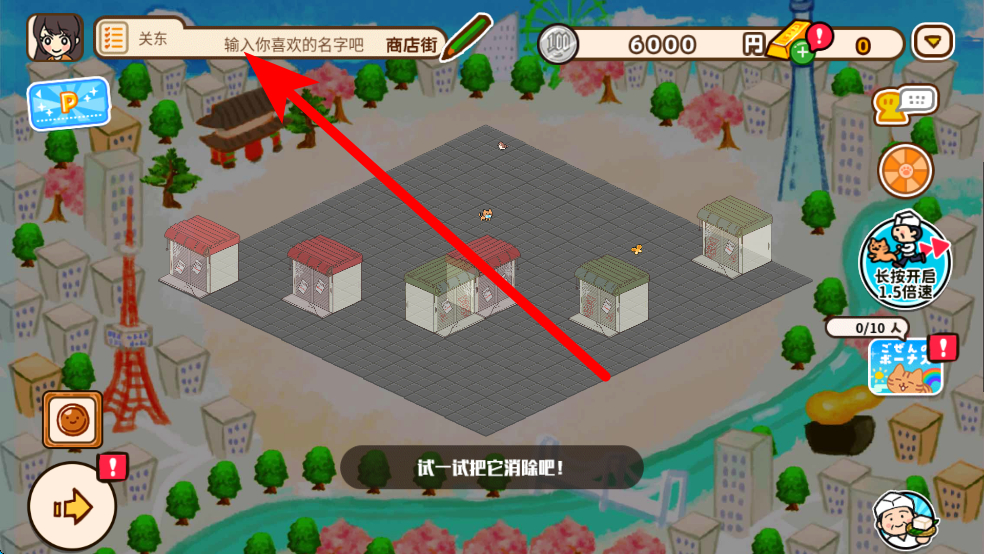 1、在界面上方有輸入名字的提示區(qū)域,玩家可根據(jù)喜好為自己的商店街輸入獨特名字,讓商店街更具個性化,增添專屬感。