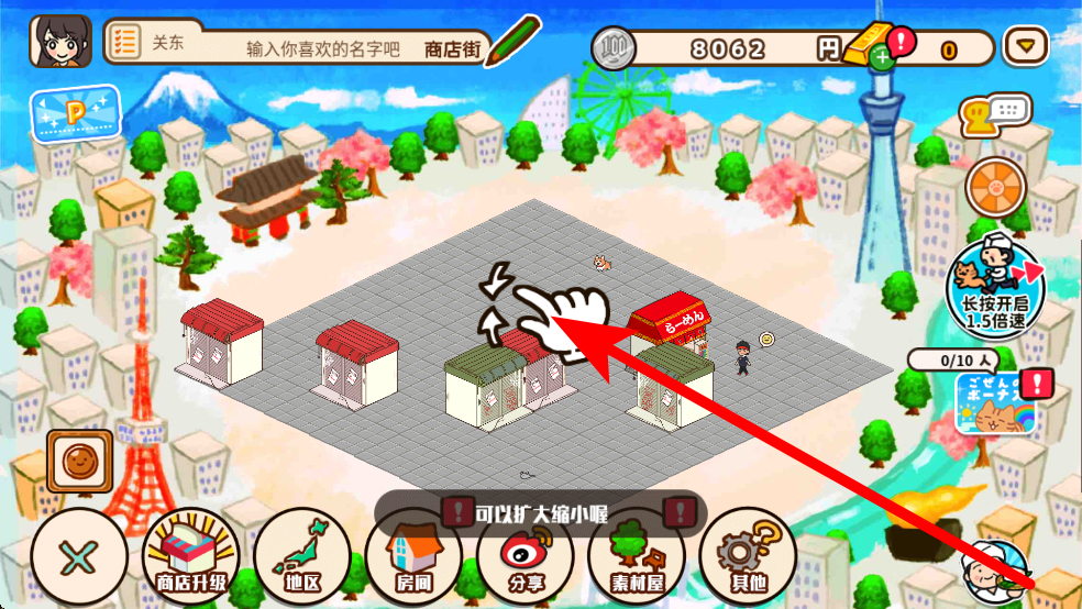 4、在主界面,可通過手指滑動操作來擴大或縮小視角,方便查看整個商店街布局,還能自由移動店鋪位置,打造出美觀且合理的街道格局。