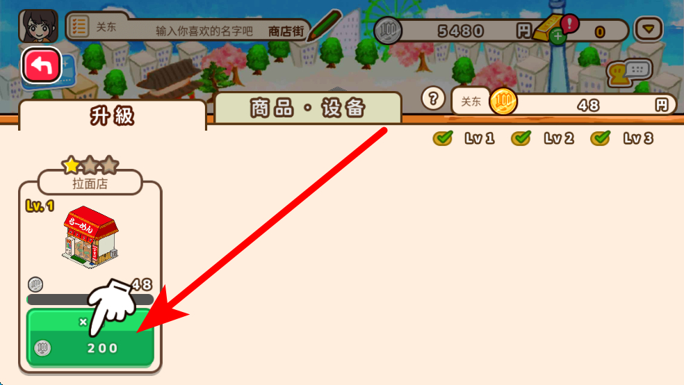 3、進入游戲后,在店鋪界面可選擇不同類型店鋪,像拉面店等,點擊對應店鋪下方標注金額的綠色按鈕,即可花費資金解鎖,助力店鋪更好經營。
