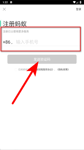 4、進(jìn)入注冊螞蟻頁面,在手機(jī)號(hào)輸入框中填入自己的手機(jī)號(hào)碼,點(diǎn)擊發(fā)送驗(yàn)證碼按鈕。