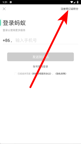3、在登錄界面,點(diǎn)擊右上角標(biāo)注著注冊預(yù)訂返積分的按鈕。