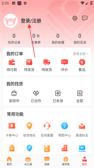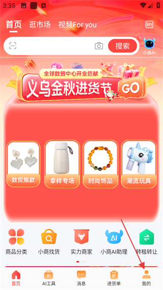 1、進(jìn)入義烏小商品城,在首頁(yè)點(diǎn)擊底部我的,進(jìn)入個(gè)人頁(yè)面。