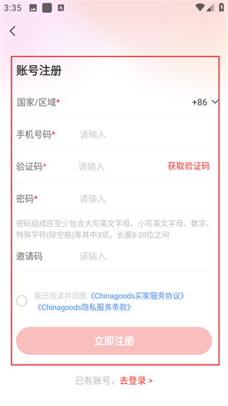 4、在賬號(hào)注冊(cè)頁(yè)面,輸入信息,同意協(xié)議后點(diǎn)擊立即注冊(cè),完成注冊(cè)操作。
