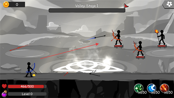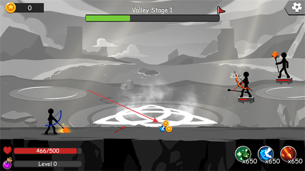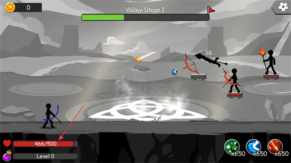 1、進(jìn)入ValleyStage1關(guān)卡,留意左下角生命值條,拉動火柴人調(diào)整射箭角度和力度攻擊敵人。