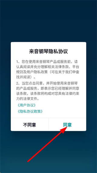 1、在來音鋼琴隱私協(xié)議彈窗中,點(diǎn)擊同意,進(jìn)入來音鋼琴主頁面。