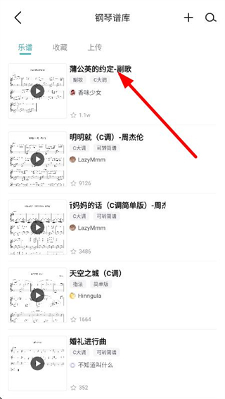 3、在鋼琴譜庫頁面,選擇要查看的樂譜,進(jìn)入該樂譜詳情頁面。