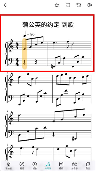 4、在樂譜詳情頁面,可查看蒲公英的約定-副歌的鋼琴譜內(nèi)容。