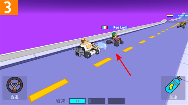 1、超越對手賽車,在賽道上找準(zhǔn)時機,操控賽車變道超越其他賽車如Red Luigi的賽車,提升排名。