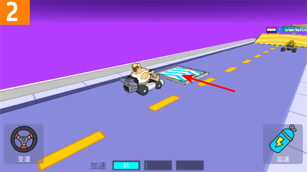 2、利用賽道加成,駕駛賽車通過藍色加速帶,獲取賽道的速度加成,增強競速優(yōu)勢,拉開距離。