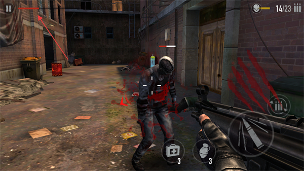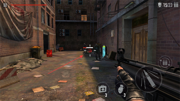 1、進入游戲場景,留意右上角僵尸剩余數(shù)量顯示15/23,滑動屏幕尋找僵尸,瞄準射擊。