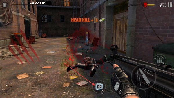 3、成功擊中僵尸,出現(xiàn)HEADKILL+10提示時,可獲得額外獎勵,血量低時點擊醫(yī)療包圖標回血。