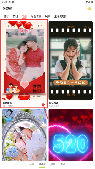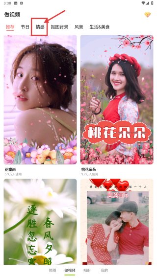 2、在視頻制作功能頁(yè)面,選擇情感分類,瀏覽情感類視頻模板列表。