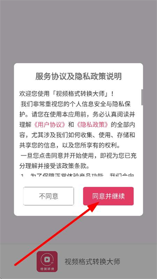 1、在隱私政策說(shuō)明彈窗中,點(diǎn)擊同意并繼續(xù),進(jìn)入主頁(yè)面。