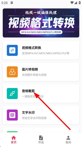 2、隨后我們?cè)谥黜?yè)面,點(diǎn)擊音頻裁剪,進(jìn)入選擇音頻頁(yè)面。