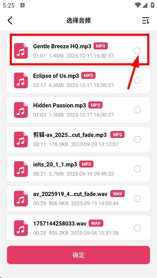 3、在選擇音頻頁(yè)面,勾選要裁剪的音頻,點(diǎn)擊確定,進(jìn)入音頻裁剪頁(yè)面。