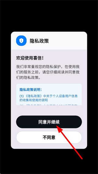 1、在隱私政策彈窗中,點擊同意并繼續(xù),進(jìn)入登錄頁面。