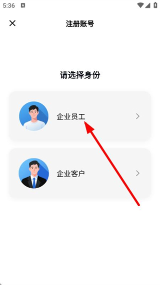 3、在注冊賬號選擇身份頁面,選擇身份企業(yè)員工,進(jìn)入注冊信息填寫頁面。