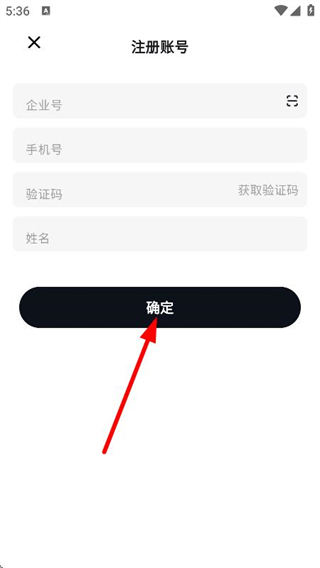 4、在注冊信息填寫頁面,輸入企業(yè)號、手機(jī)號、驗證碼、姓名后,點擊確定,完成注冊賬號操作。