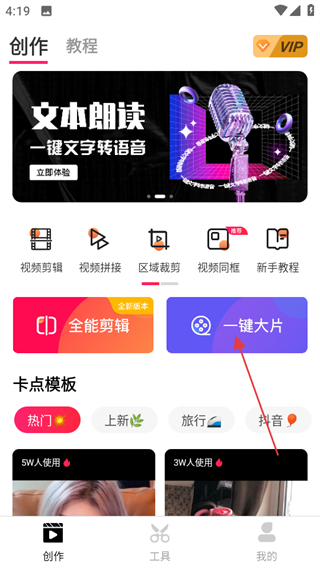 1、在創(chuàng)作頁面,點擊一鍵大片,進入素材選擇頁面。