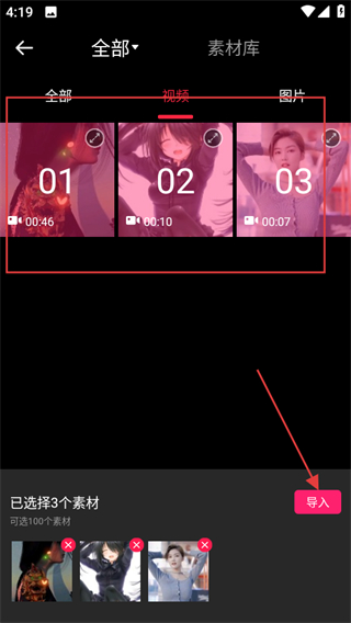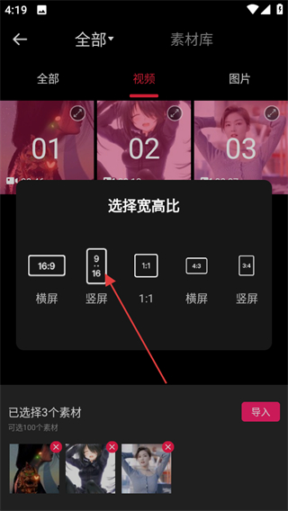 2、在素材選擇頁面,選擇要使用的視頻素材后,點擊導入,進入寬高比選擇頁面。