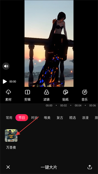 4、在視頻編輯頁面,選擇萬圣夜等特效添加到視頻中,成功制作視頻。