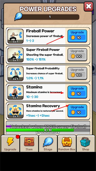 2、升級火球威力、耐力和耐力恢復(fù)等屬性,提升角色的戰(zhàn)斗和持續(xù)破壞能力。