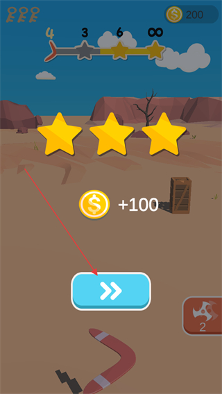 4、成功擊中目標(biāo),獲得三顆星和+100金幣獎(jiǎng)勵(lì),點(diǎn)擊藍(lán)色按鈕進(jìn)入下一關(guān)。