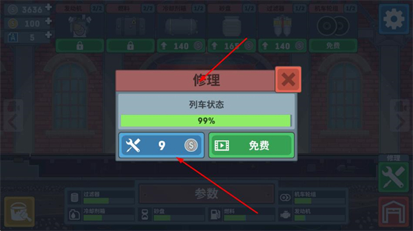 4、還可對列車進(jìn)行修理,點(diǎn)擊修理按鈕,可選擇花費(fèi)一定數(shù)量的工具或者通過觀看廣告免費(fèi)修理,以此保證列車處于良好的運(yùn)行狀態(tài)。