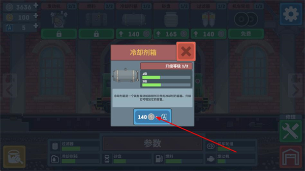3、點(diǎn)擊想要升級的部件,比如冷卻劑箱,會彈出該部件的升級界面,顯示當(dāng)前的升級等級和升級所需的費(fèi)用,支付相應(yīng)費(fèi)用后,即可完成對該部件的升級。