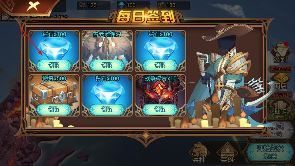 1、參與每日簽到活動(dòng),領(lǐng)取鉆石、古老雕像、物資、戰(zhàn)爭(zhēng)碎片等獎(jiǎng)勵(lì)。