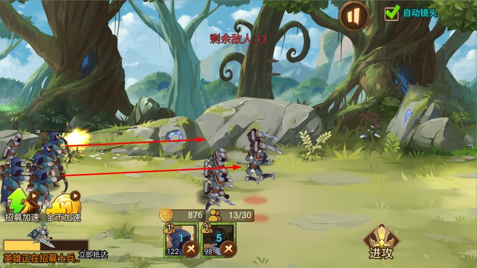 3、操控英雄和士兵進(jìn)攻敵方單位,通過(guò)戰(zhàn)斗消滅敵人,推進(jìn)關(guān)卡進(jìn)程,同時(shí)注意部隊(duì)的戰(zhàn)力搭配和生存。