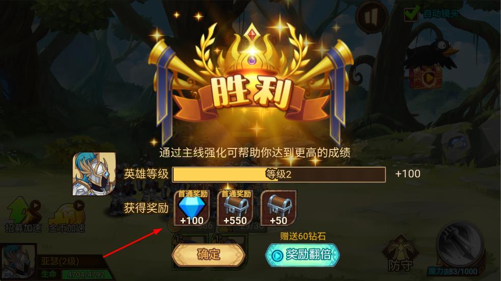 4、戰(zhàn)斗勝利后獲取英雄等級(jí)提升、鉆石、金幣等獎(jiǎng)勵(lì),用于強(qiáng)化英雄和部隊(duì),挑戰(zhàn)更高難度關(guān)卡。