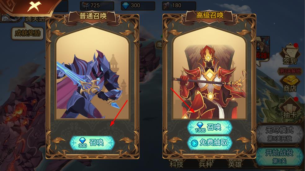 1、通過普通召喚和高級(jí)召喚獲取英雄,擴(kuò)充戰(zhàn)力陣容。