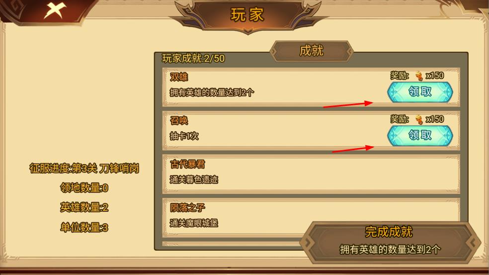 2、完成雙雄、召喚等成就任務(wù),領(lǐng)取資源獎(jiǎng)勵(lì),積累養(yǎng)成材料。