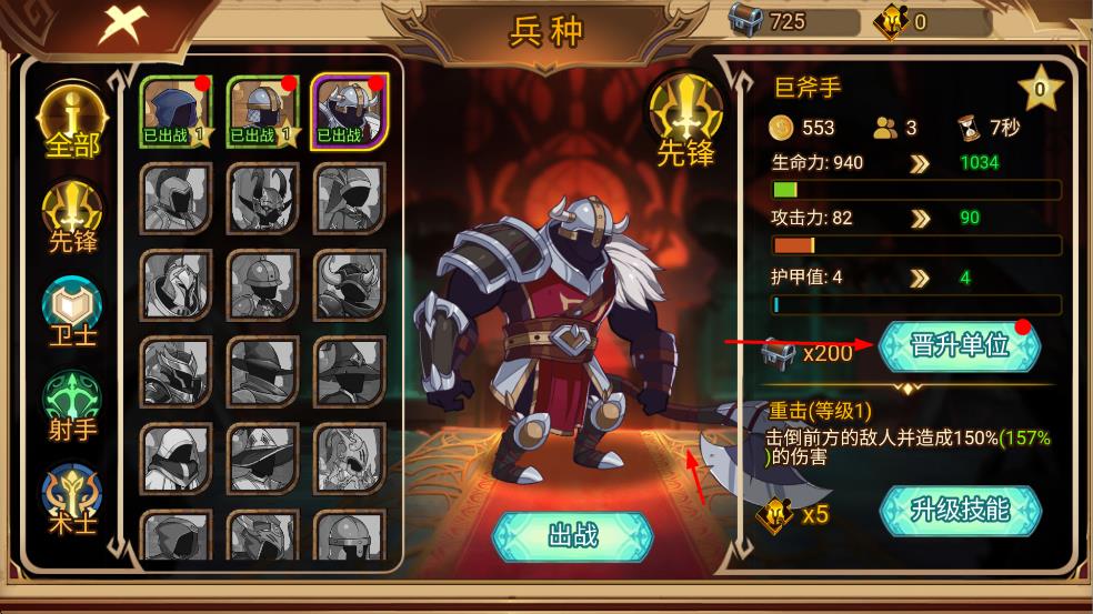 3、在兵種界面晉升單位、升級(jí)技能,提升生命值、攻擊力等屬性,強(qiáng)化部隊(duì)?wèi)?zhàn)力。