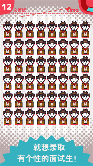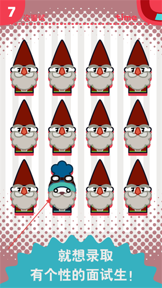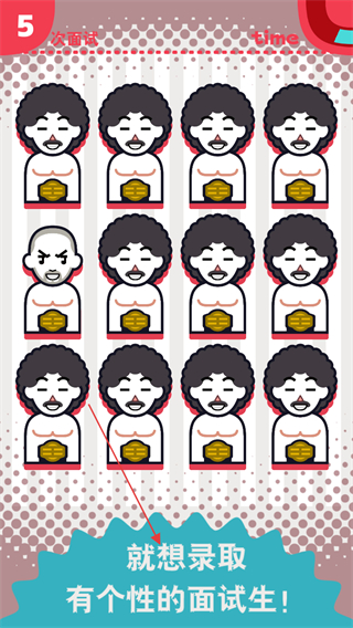 1、進(jìn)入第5次面試關(guān)卡,在眾多形象相似的面試生中,找出形象獨(dú)特的那位并點(diǎn)擊選擇,目標(biāo)是錄取有個性的面試生。