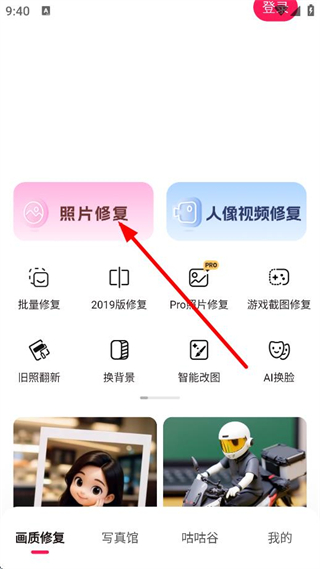 1、在APP頁面,點擊照片修復(fù),進(jìn)入照片修復(fù)引導(dǎo)頁面。