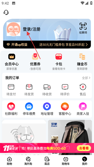 2、在個人頁面,點擊登錄注冊,進入登錄選擇頁面。