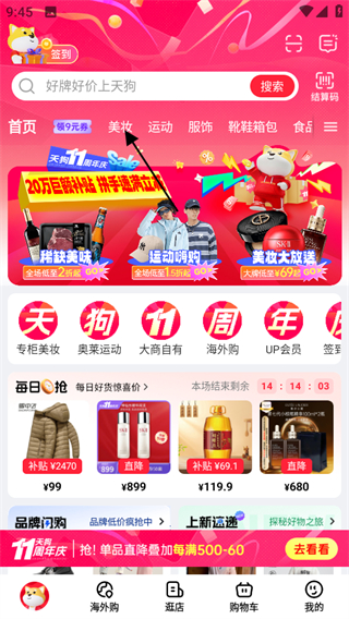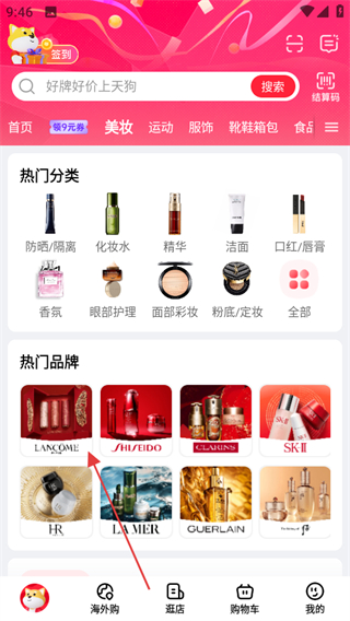 1、進(jìn)入大商天狗,在首頁點(diǎn)擊頂部美妝,進(jìn)入美妝分類頁面。