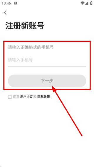 4、在注冊(cè)新賬號(hào)頁(yè)面,輸入正確格式的手機(jī)號(hào)后,點(diǎn)擊下一步,繼續(xù)注冊(cè)流程。