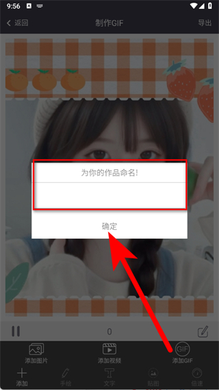 5、在彈出的為你的作品命名彈窗中,輸入作品名稱,點擊確定,完成GIF的制作與導出。